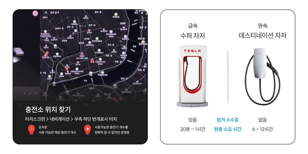 1. 터치스크린에 표시된 지도에서 충전소 위치를 확인해 주세요.