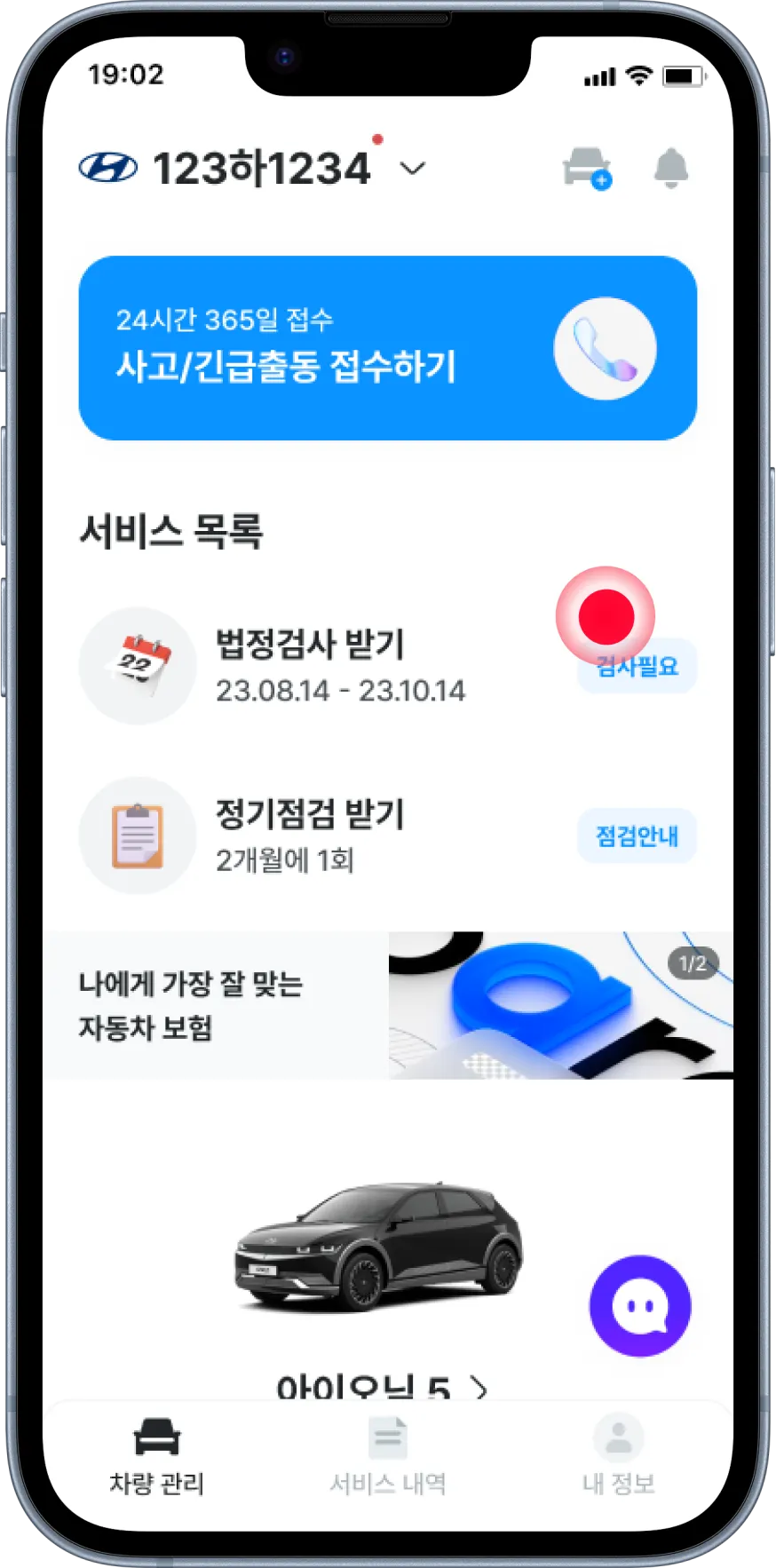 [1단계] 홈화면에서 법정검사를 눌러주세요.